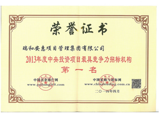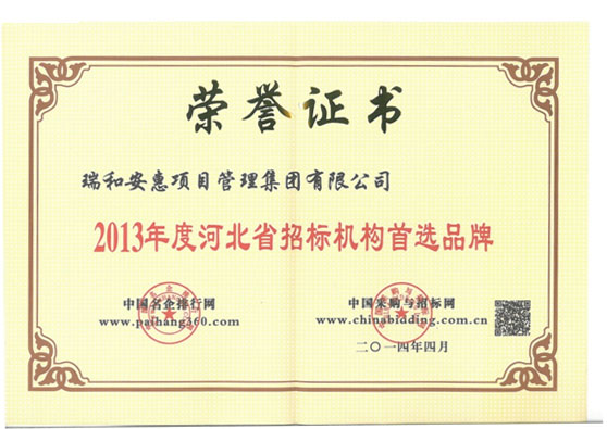 2013年2月,第八届全国招投标领域年度聚焦活动中,我公司积极准备材料申报及网络投票活动,在九州平台(中国)有限公司官网公司全体员工的大力支持下,历时21天的不懈努力,取得了网络票选第一名的好成绩。后经各项审核,最终荣获 “2013年度中央投资项目最具竞争力第一名”、“2013年度河北省招标机构首选品牌”两项殊荣。我公司获得该荣誉是九州平台(中国)有限公司官网公司每位员工辛勤付出的回报。希望大家再接再励,再创佳绩!