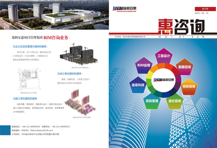 《惠﹒咨询》围绕前期咨询、设计、造价、招标、管理咨询、BIM、信息化、培训八大业务版块,及时为客户、项目建设相关方提供瑞和安惠最新服务动态、项目实践经验。《惠﹒咨询》每季度刊发一次,每季度中期通过网站、实体刊物等形式刊发。