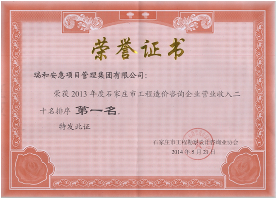 公司喜获“2013年度石家庄市工程造价咨询企业营业收入二十名排序第一名”