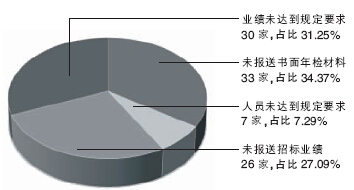 去年检查结果显示,2013年有54家代理机构不合格,其中3家被撤销资质。据统计,未报送书面年检材料的有11家,报送的招标业绩经审查未达到规定要求的有29家,报送的招标从业人员经审查未达到规定要求的有14家。