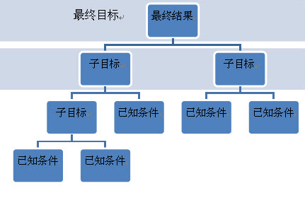 其实这种倒推的方法大家并不陌生,项目管理本身就是从目标出发的,这一点从“项目”的定义就可以看出,“为了实现特定的目标而采取的一系列行动”,所有的行动都是目标导向的。例如在进行范围分析、编写WBS的过程中,就是采用的自顶向下的分解、倒推的方法。同样,在倒推寻找充分条件的过程中,我们也可以采用类似的方式,从目标出发,逐步分析、分解充分条件: