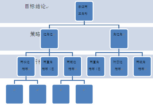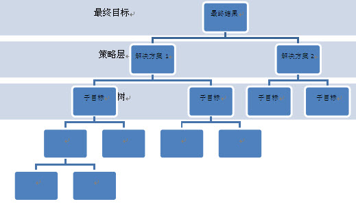在这样一个分析结构当中,经过实践发现,第一步应该增加一个层次,提供不同策略的选择分支,然后才是不同策略下所需要的充分条件。这种方式的好处在于,当存在不同的可选解决方案时,这种分析方法对于决策能提供很好的支持。同时,在以后项目实施过程中如果条件发生了变化,还可能利用当时已有的条件,通过另外分支中的解决方案来实现目标。