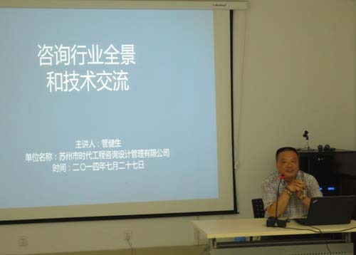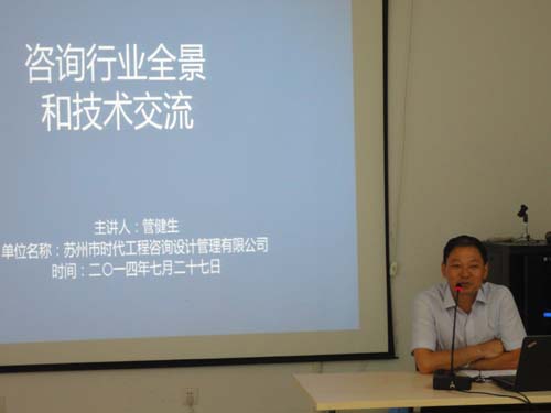 2014年7月27日,苏州市工程咨询协会举办了免费讲座,由苏州市时代工程咨询设计管理有限公司管主任主讲,内容为《咨询行业全景和技术交流》,全市有30多名咨询工程师参加了本次讲座。