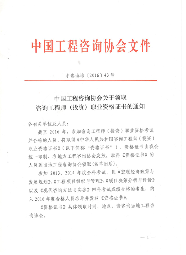 中国工程咨询协会关于领取咨询工程师(投资)职业资格证书的通知