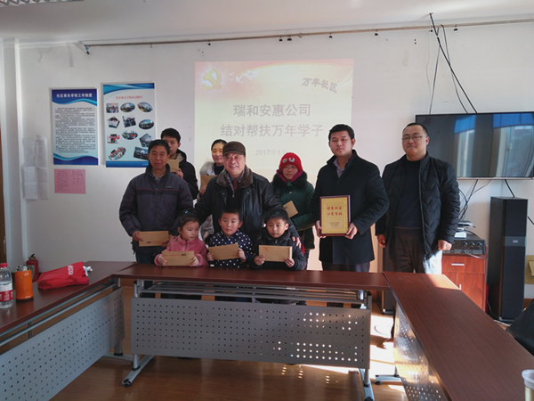 2017年1月20日上午,我公司总经理王燕鸣、市场总监芮锐锐等参加了瑞和安惠公司结对帮扶万年学子活动。活动现场,公司王燕鸣总经理鼓励学生们要乐观积极,好好读书,通过学习改变命运。活动结束后,公司领导及万年社区居委会一行人走访了其中2户受助家庭,了解受助家庭的实际困难,提供切实帮助。此次活动我公司共结对助学10户,累计捐助助学金5000元,获中共万年社区党委,万年社区居委会颁发的“情系社区,心系百姓”证书。瑞和安惠公司始终不忘自己的社会责任,在结对助学的同时,也为姑苏区慈善基金会捐款5000元,用以资助社会慈善公益事业。