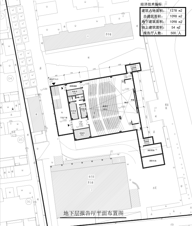 项目位于彩香实验中学校区内厚学楼和厚乐楼中间,原篮球场区域,用地面积为1278.0平方米(约合1.92亩),拟新建总建筑面积为1098.0平方米,为单层半地下下沉式建筑。其中:地下建筑面积为1098平方米;地上建筑面积54.0平方米;其中,地面以上高度2.0米,地面以下最大深度6.6米,设计容纳人数500人。项目拟建设为综合报告厅,主要功能为学术报告、讲座、各种工作会议及文艺演出等。