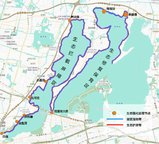 苏州市阳澄湖综合整治工程生态修复工程位于相城区境内阳澄湖,涉及阳澄西湖、阳澄中湖长约76.6公里的受损岸线,建设内容包括入湖河口强化预处理工程、生态护岸带构建工程、湖滨湿地带修复工程。
